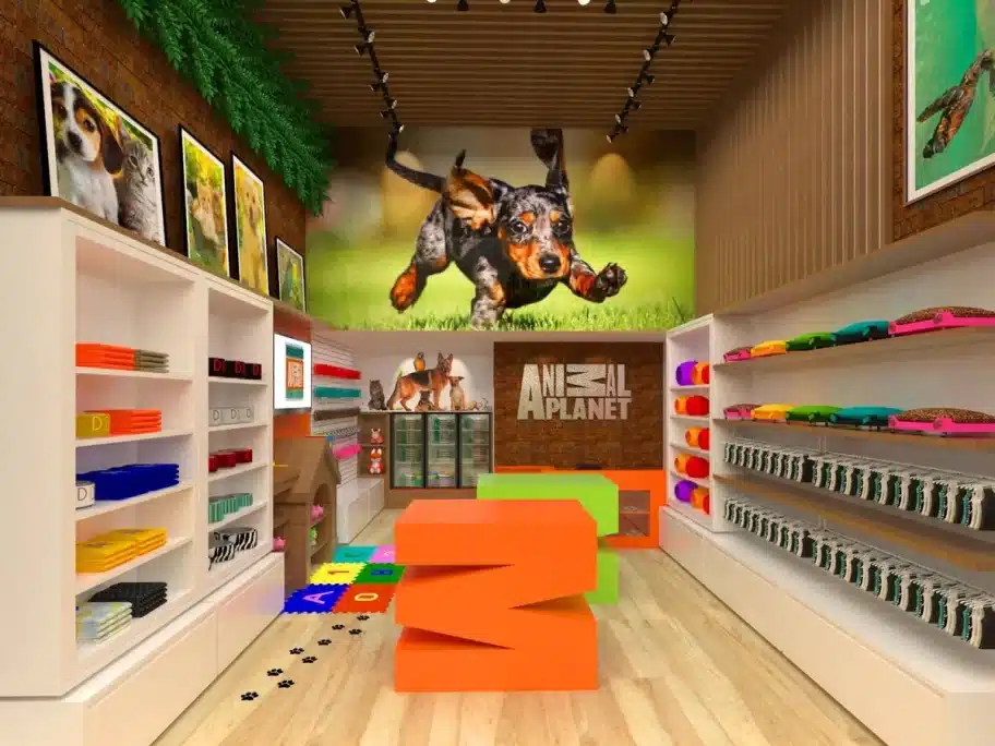 Fachada colorida de loja infantil Bambini Park com projeto de arquitetura comercial voltado para a experiência do cliente.